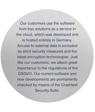 Our customers use the software from bao solutions as a service in the cloud, which was developed and is hosted entirely in Germany. Access to external data is excluded by strict security measures and the latest encryption technologies. Just like our customers, we attach great importance to the regulations of the DSGVO. Our current software and new developments are permanently checked by means of the Crashtest Security Suite.